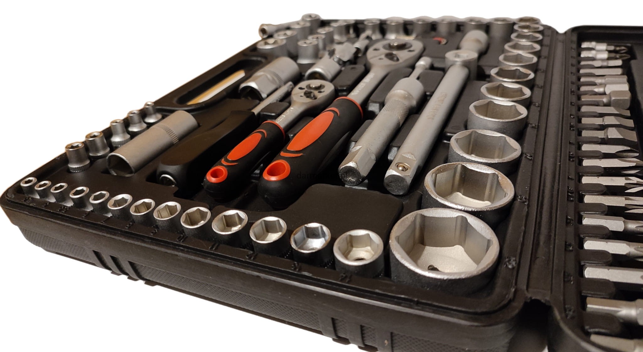 - Bogaty wybór bitów i nasadek – w tym nasadki długie, nasadki do świec oraz bity Torx, Hex i Pozidriv.