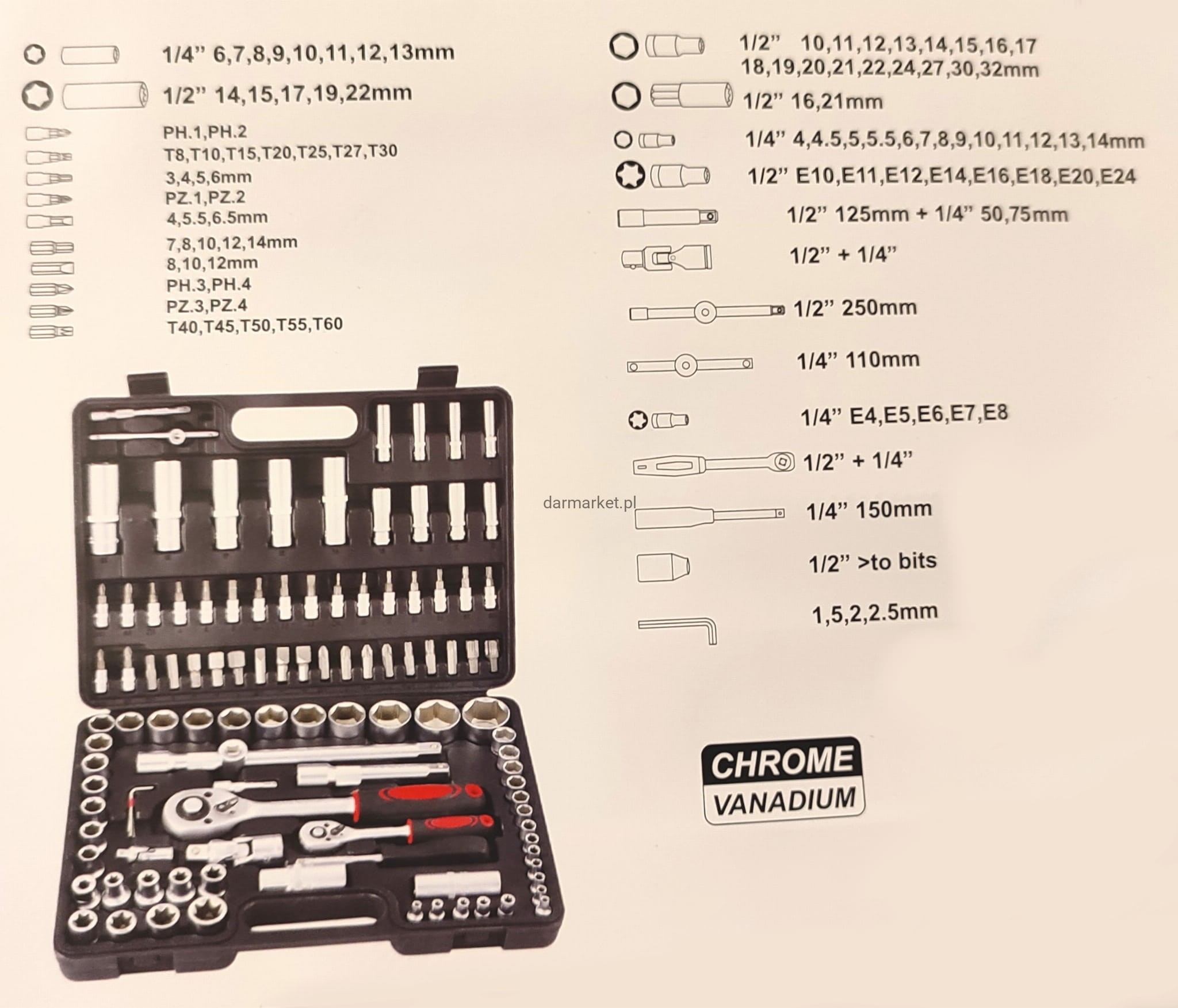 - Kompletny zestaw – 108 elementów w jednej walizce pokrywa zapotrzebowanie na większość prac mechanicznych i montażowych.