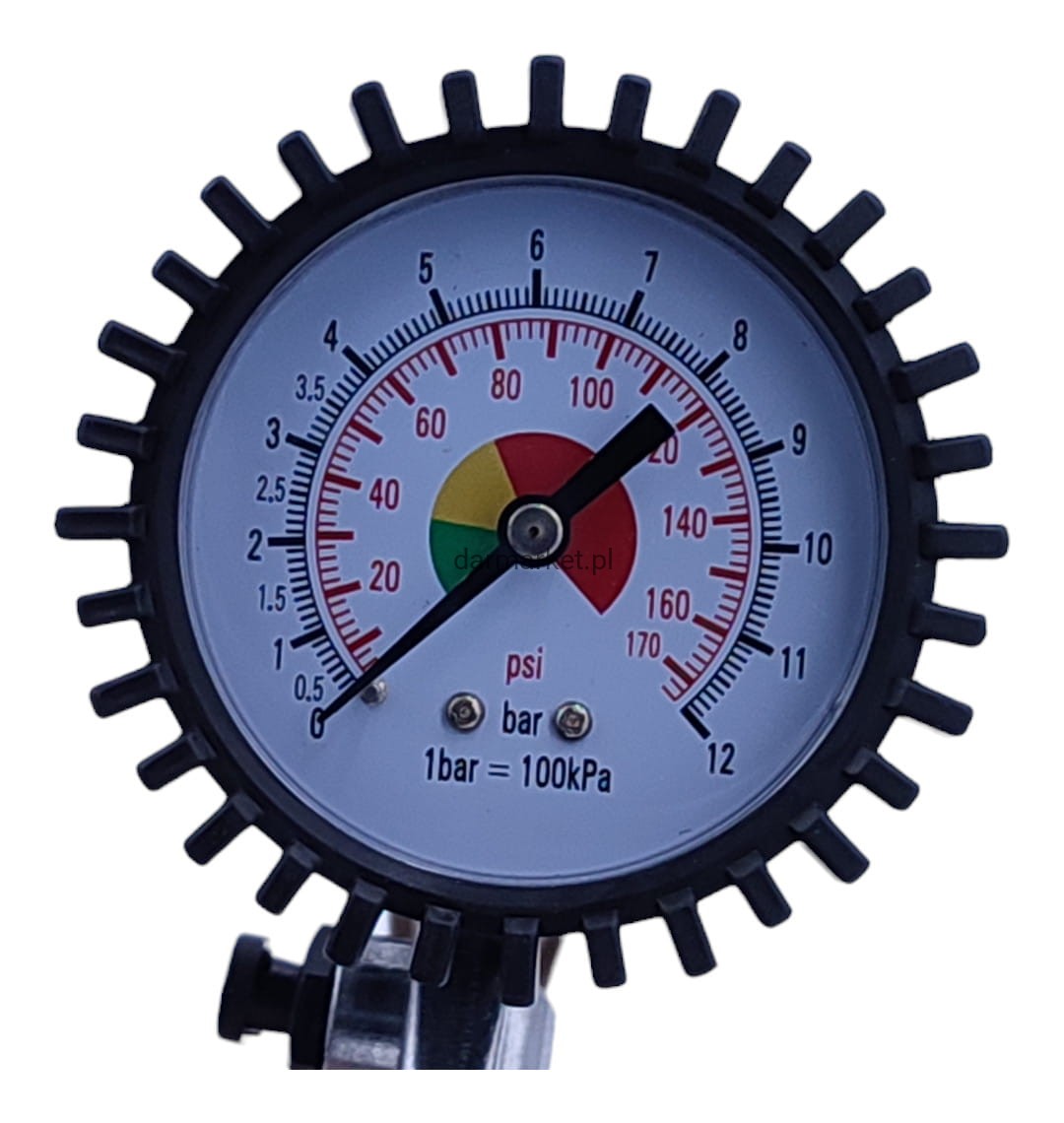 - Czytelny manometr – duża tarcza wyskalowana w barach i psi pozwala na precyzyjną kontrolę ciśnienia w oponach.