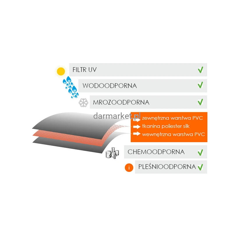 - Technologia trzech warstw – elastyczny poliestrowy rdzeń otulony dwiema powłokami skompresowanego PVC sprawia, że plandeka nie rwie się nawet w najtrudniejszych okolicznościach.