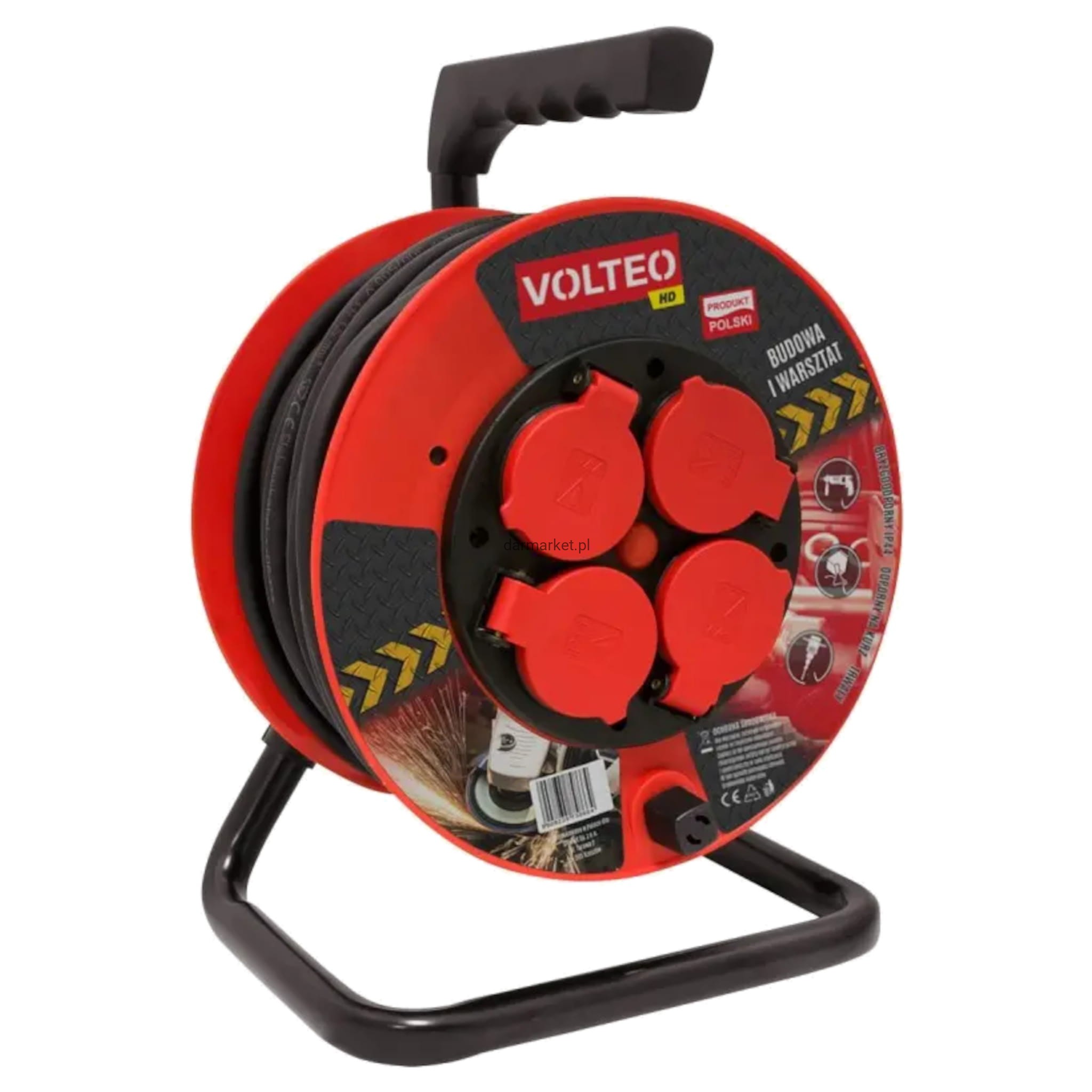 Przedłużacz Bębnowy Budowlany 30 m 3x1.5 mm² Volteo do zadań budowlanych, wyposażony w elastyczną, gumową izolację i gniazda IP44. Zapewnia ochronę termiczną oraz łatwe przenoszenie dzięki mocnemu stelażowi.