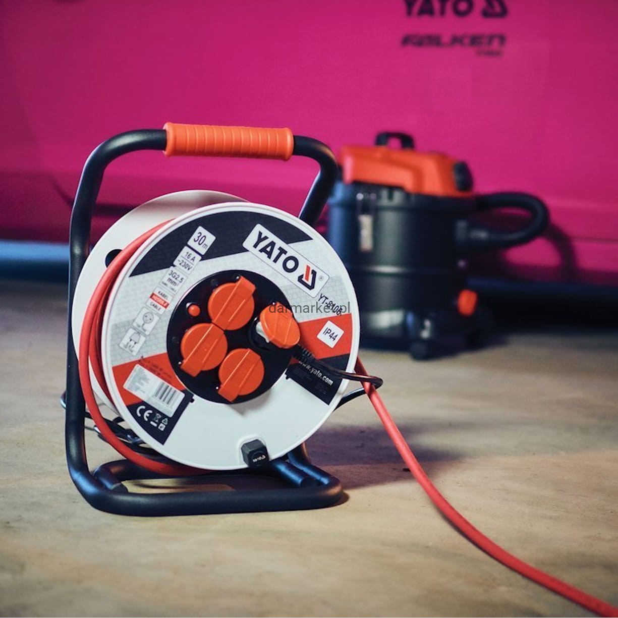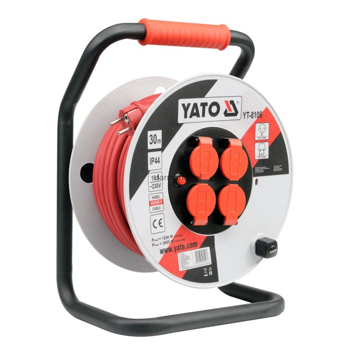 Przedłużacz Budowlany Bębnowy 30 m 3x2.5 mm² Yato to sprzęt Heavy Duty dla wymagających. Gruby przewód z gumy naturalnej (RR-F) obsługuje moc 3600 W. Czerwony przewód chroniony IP44.