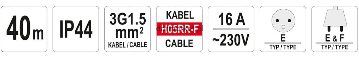Przedłużacz Budowlany Bębnowy 40 m 3x1.5 mm² Yato to urządzenie z imponującym 40-metrowym, gumowym kablem (RR-F) o stopniu IP44. Zapewnia ochronę termiczną, miedziane żyły i bezkonkurencyjną odporność.